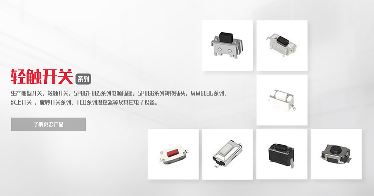 公司專業生產船型開關、輕觸開關、SP861-865系列電源插座、SP866系列轉換插頭、WW11系列微動開關、WW01-03、09系列按鈕開關DS、WW系列指示燈開關、WW603G系列 線上開關 、旋轉開關系列、TCD系列溫控器等及其它電子設備。
